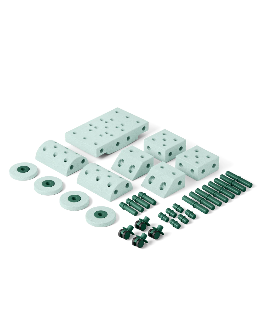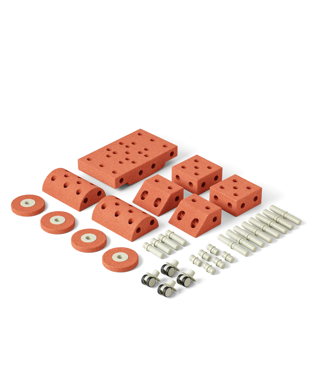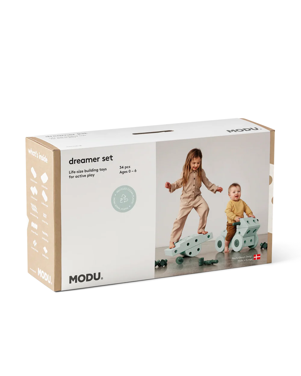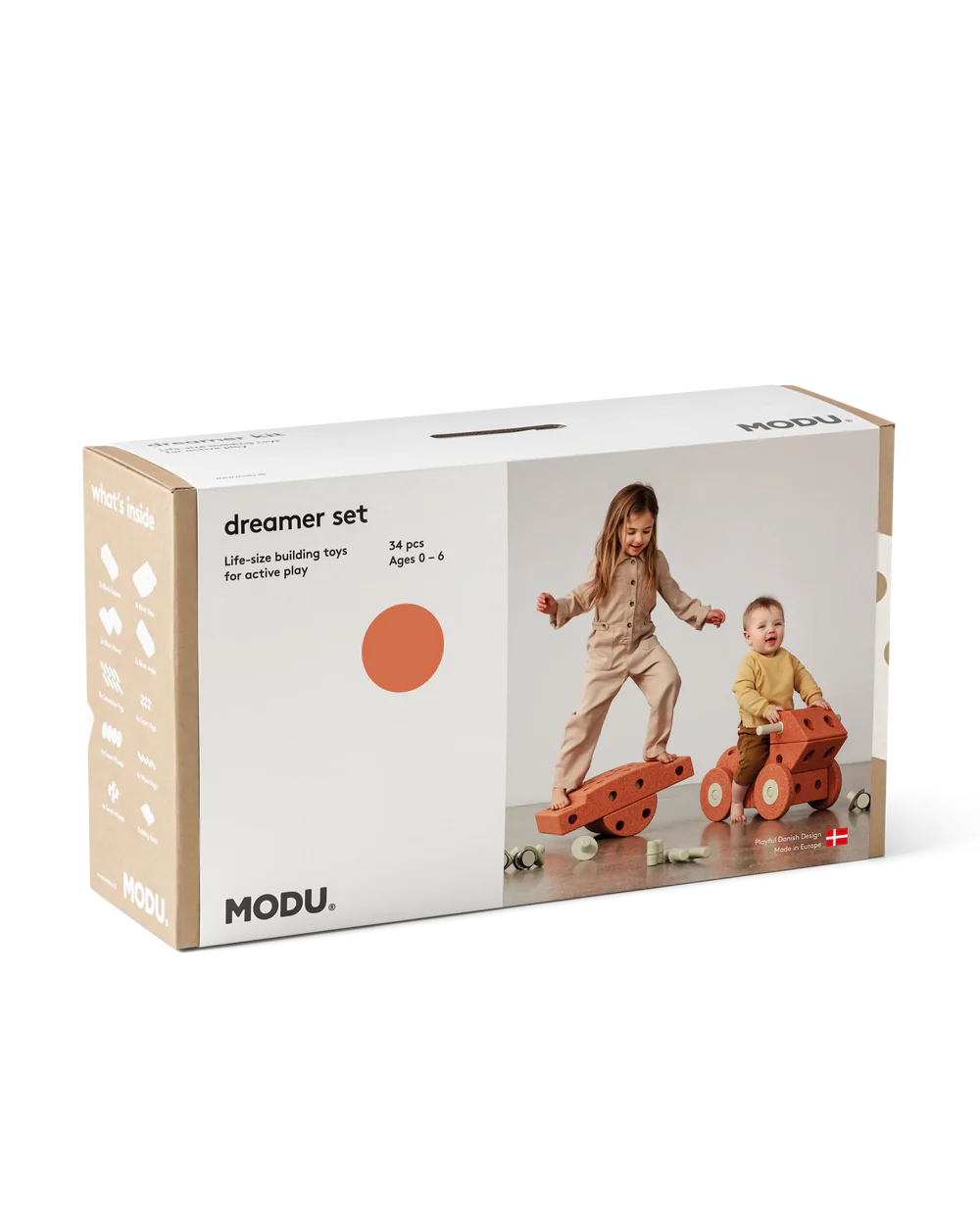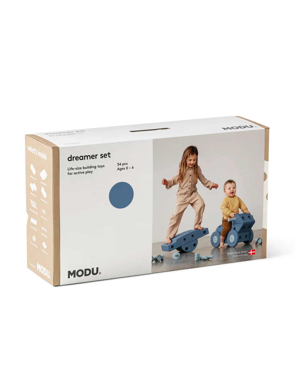 In the MODU Explorer Kit you can find 34 pcs (7x Blocks, 18x Pegs, 4x Swirly Wheels, 4x Foam Wheels) and an inspiration booklet so you can start building!